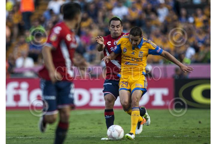 MONTERREY, NUEVO LEÓN, 30ABRIL2016.- André Pierre Gignac del equipo de los Tigres de la UANL, se disputa el balón con Horacio Cervántes del equipo de los Tiburones Rojos del Veracrúz, en el estadio Universitario, partido correspondiente a la jornada 16 de la Liga MX, Clausura 2016. Marcador Final: Tigres: 0- Veracrúz: 0. FOTO: GABRIELA PÉREZ MONTIEL / CUARTOSCURO.COM