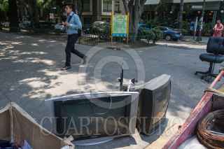 CIUDAD DE MÉXICO, 02MAYO2016.- Dos televisores antiguos son recogidos por un chatarrero, quien reconoce que los televisores funcionan a pesar de que no reciben la señal digital, por lo que aún se pueden vender si se les coloca un decodificador. FOTO: ISAAC ESQUIVEL /CUARTOSCURO.COM