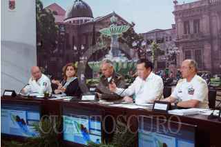 SAN LUIS POTOSÍ, S.L.P., 02MAYO2016.- Renato Sales, Comisionado Nacional de Seguridad; Arely Gómez González, Procuradora General de la República; Salvador Cienfuegos Zepeda, secretario de la Defensa Nacional, Miguel Ángel Osorio Chong, secretario de Gobernación, y Almirante Vidal Francisco Soberón Sanz, secretario de Marina, durante la Reunión de Seguridad Zona Noreste. FOTO: SEGOB /CUARTOSCURO.COM