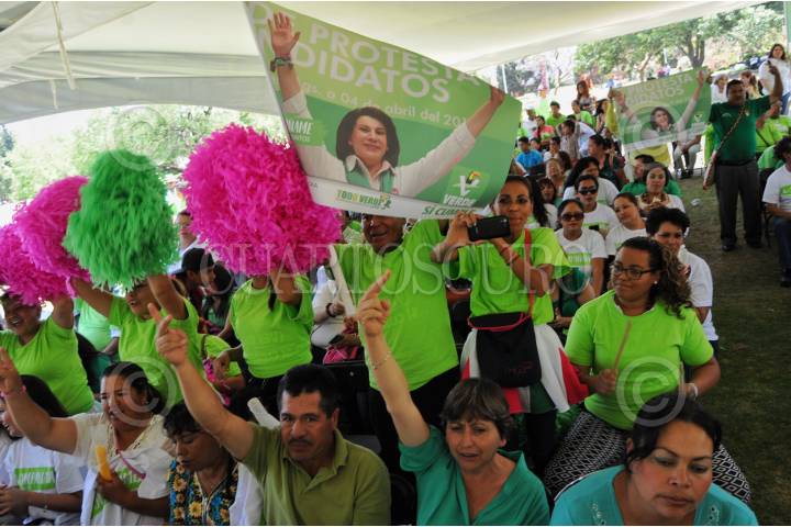 AGUASCALIENTES, AGUASCALIENTES, 03MAYO2016.- Seguidores de Lorena Martínez, candidata a la gubernatura del estado por la alianza Partido Verde, PRI, PT y Nueva Alianza, durante el evento proselitista en el parque Cedazo, para firmar un decálogo de política verde, en el que la candidata se compromete a realizar políticas públicas a favor de la conservación del medio ambiente, en caso de ganar las elecciones del próximo 5 de junio. FOTO: DIEGO SIMÓN SÁNCHEZ /CUARTOSCURO.COM