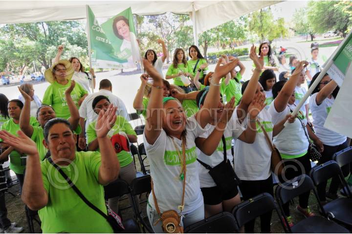 AGUASCALIENTES, AGUASCALIENTES, 03MAYO2016.- Seguidores de Lorena Martínez, candidata a la gubernatura del estado por la alianza Partido Verde, PRI, PT y Nueva Alianza, durante el evento proselitista en el parque Cedazo, para firmar un decálogo de política verde, en el que la candidata se compromete a realizar políticas públicas a favor de la conservación del medio ambiente, en caso de ganar las elecciones del próximo 5 de junio. FOTO: DIEGO SIMÓN SÁNCHEZ /CUARTOSCURO.COM
