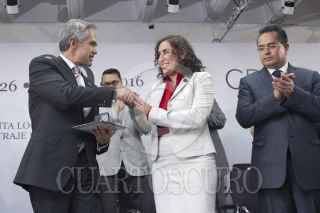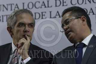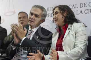 CIUDAD DE MÉXICO, 04MAYO2016.- Miguel Ángel Mancera, Jefe de Gobierno de la CDMX, y Margarita Darlene Rojas Olvera, presidenta de la Junta Local de Conciliación y Arbitraje de la CDMX, durante la celebración del 90 aniversario de este organismo encargado de repartir justicia a los trabajadores en sus litigios laborales ante los patrones. FOTO: MOISÉS PABLO /CUARTOSCURO.COM