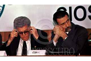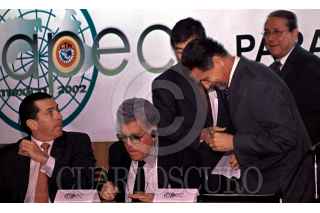 Leonardo Rodriguez Alcaine, secretario general de la Confederación de Trabajadores de México, (CTM) y Carlos Abascal Carranza, secretario del Trabajo, mantuvieron una reunión de trabajo con con empresarios que asistirán a la reunión de APEC 2002 a mediados de octubre en Los Cabos, Baja Claifornia Sur. FOTO: Eunice Adorno/CUARTOSCURO.COM