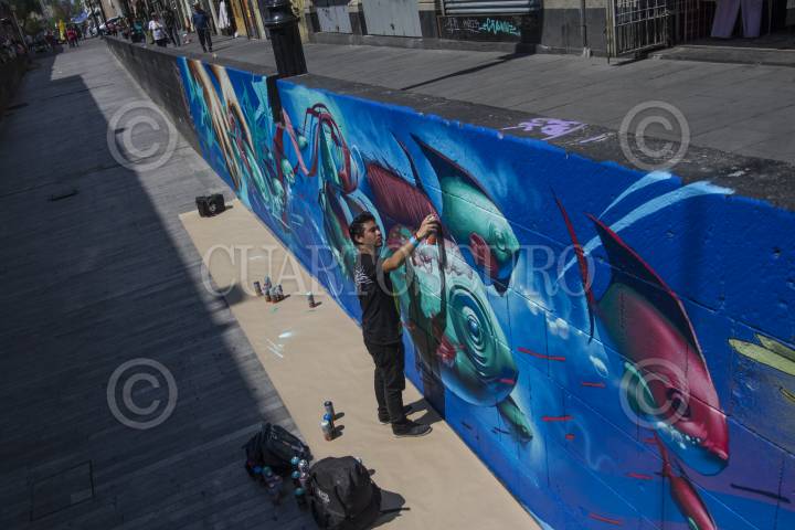 CIUDAD DE MÉXICO, 08MAYO2016.- Artistas urbanos intervinieron el espacio urbano afuera del Templo de la Santísima Trinidad, con una exhibición de murales pictóricos que busca el rescate de la zona. FOTO: ISAAC ESQUIVEL /CUARTOSCURO.COM