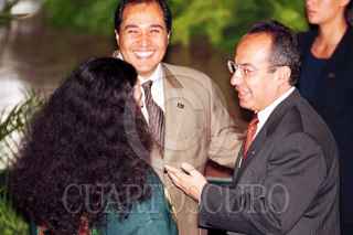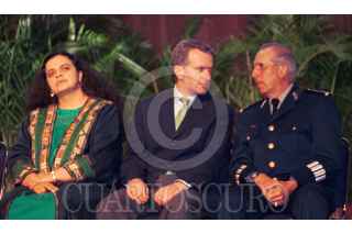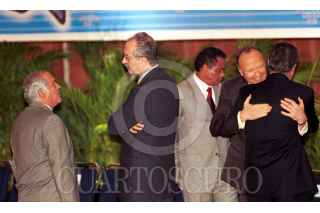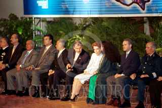 Santiago Creel Miranda, secretario de Gobernación y Ricardo García Cervantes, secretario de la Defensa dialogan mientras a su lado Beatriz Paredes escucha la intevención del presidente Vicente Fox. FOTO: Oswaldo Ramírez/CUARTOSCURO.COM