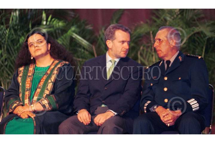 Santiago Creel Miranda, secretario de Gobernación y Ricardo García Cervantes, secretario de la Defensa dialogan mientras a su lado Beatriz Paredes escucha la intevención del presidente Vicente Fox. FOTO: Oswaldo Ramírez/CUARTOSCURO.COM