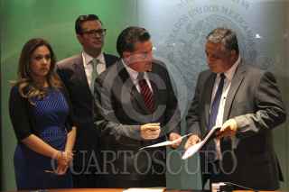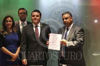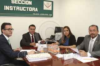 CIUDAD DE MÉXICO, 11MAYO2016.- Los diputados Juan Pablo Piña, Ricardo Ramírez, Sandra Méndez y Omar Ortega, quienes integran la sección instructora votaron por unanimidad el desafuero de la diputada de Sinaloa, Lucero Sánchez López, a quien se le vincula con Joaquín Guzmán Loera "El Chapo" y se le señala de visitarlo en el penal del Altiplano utilizando una credencial de elector falsa. Los legisladores le entregaron el dictamen a Pascual Juarez, secretario técnico de la mesa directiva de la Cámara de Diputados. Se prevé que se convoque a un periodo extraordinario el 16 de mayo para votarlo. FOTO: CUARTOSCURO.COM