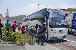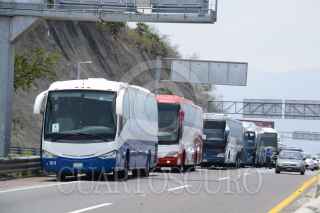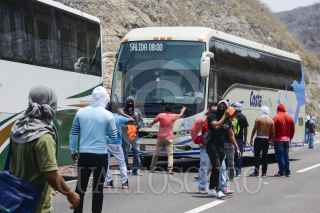 CHILPANCINGO, GUERRERO, 11MAYO2016.- Estudiantes de la Normal Rural de Ayotzinapa llevaron a cabo un boteo en el crucero de Tierras Prietas al sur de la ciudad, se apoderaron de tres autobuses del servicio público para trasladarse a las movilizaciones de la Ciudad de México, para exigir la presentación con vida de los 43 alumnos desaparecidos en Iguala y para exigir la destitución del director de la Agencia de Investigación Criminal de la Procuraduría General de la República (PGR), Tomás Zerón de Lucio, por presuntas irregularidades en la investigación. Al lugar llegaron policías federales a bordo de diez autobuses; cuando los normalistas tenían escasos cinco minutos de haberse retirado con dirección a Tixtla. FOTO: JOSÉ I. HERNÁNDEZ /CUARTOSCURO.COM