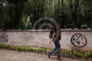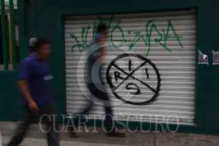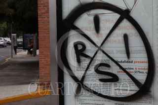 MORELIA, MICHOACÁN, 12MAYO2016.- En al menos 10 puntos de la capital michoacana, principalmente en fachadas de comercios, amanecieron este miércoles pintas del grupo armado autodenominado “Insurgencia por el Rescate Institucional y Social” (IRIS) surgido el pasado mes de febrero en Tierra Caliente.Las pintas consisten en un círculo dividido en cuatro partes y en cada cuarto una letra de la palabra IRIS, signo con el que se identifica el grupo armado que ha puesto en entredicho la capacidad del gobierno federal para combatir el crimen organizado en el país y en Michoacán. FOTO: ALAN ORTEGA /CUARTOSCURO.COM