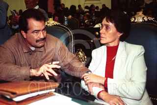 Fernando Espino, diputado priísta y líder sindical del metro, platica con María de los Angeles Moreno, líder de la bancada priísta en la Asamblea capitalina, durante la sesión ordinaria de esta cámara. FOTO: Juan Pablo Zamora/CUARTOSCURO.COM