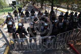 MORELIA, MICHOACÁN, 18MAYO2016.- Más de 3 mil elementos de la Policía Michoacán y la Policía Federal, custodian el Centro de Convenciones para procurar la realización de la prueba ENLACE, esta evaluación se llevará a cabo el día jueves 18 de mayo y los docentes están citados desde las 7 a.m. FOTO: ALAN ORTEGA /CUARTOSCURO.COM