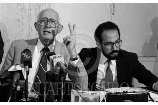 CIUDAD DE MÉXICO, 18MAYO2016.- Luis H. Alvárez murió a los 96 años de edad, fue el primer presidente municipal de oposición en Chihuahua en el año de 1983 y ex líder del PAN, muchos lo consideraban como el ideólogo del partido blanquiazul. La imagen es del 22 de febrero de 1990 durante su conferencia semanal en el PAN, lo acompaña el ex presidente Felipe Calderón. FOTO: JULIO CANDELARIA /ARCHIVO/CUARTOSCURO.COM