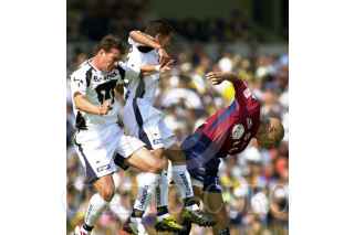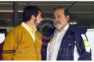 Juan Ramón de la Fuente, rector de la UNAM y el empresario Carlos Slim, al final del juego en el cual los universitarios perdieron ante el Morelia en la cancha de C.U. FOTO: Oswaldo Ramírez/CUARTOSCURO.COM