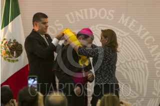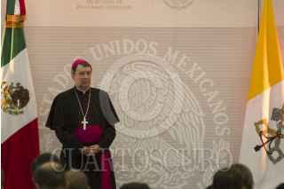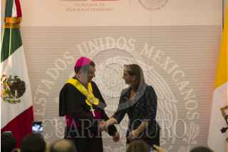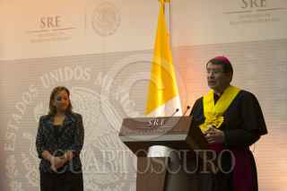 CIUDAD DE MÉXICO, 30MAYO2016.- El Nuncio Apostólico Christophe Pierre recibió la condecoración de la Orden Mexicana del Águila Azteca, en grado de banda, por la canciller Claudia Ruíz Massieu. FOTO: MOISÉS PABLO /CUARTOSCURO.COM