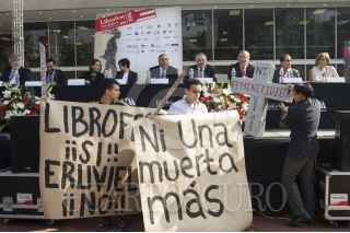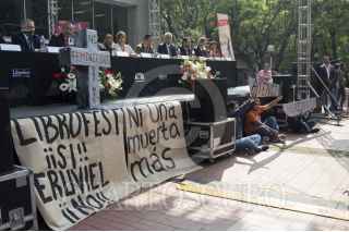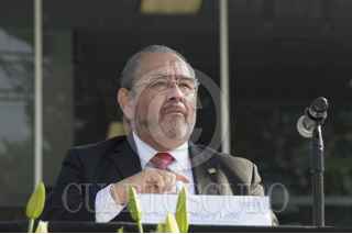 CIUDAD DE MÉXICO, 30MAYO2016.- Salvador Vega y León, rector de la Universidad Autónoma de México, junto con Dragoberto Rodríguez Barrera, embajador extraordinario y plenipotenciario de Cuba, realizaron el corte e inauguración del Librofest Metropolitano 2016 en las instalaciones de la UAM Azcapotzalco. Este año el Estado de México es el invitado especial al festival literario debido a la gran cantidad de alumnos que viven en dicha entidad, durante la conferencia previa al corte de listón estudiantes del plantel se manifestaron con pancartas en contra de la política del gobernador Erúviel Ávila y la llamada Ley Atenco. FOTO: GALO CAÑAS /CUARTOSCURO.COM