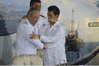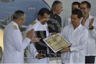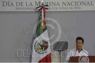 MANZANILLO, COLIMA, 01JUNIO2016.- El presidente Enrique Peña Nieto acompañado por Vidal Francisco Soberón Sanz, secretario de Marina; José Ignacio Peralta Sánchez, gobernador de Colima; Salvador Cienfuegos Zepeda, secretario de la Defensa Nacional; Gerardo Esparza, secretario de Comunicaciones y Transportes; Enrique Pacchiano, secretario de Medio Ambiente y Recursos Naturales; Enrique de la Madrid Cordero, secretario de Turismo; Arely Gómez, procuradora general de la República y José Eduardo Calzada, secretario de Agricultura, Ganadería, Desarrollo Rural, Pesca y Alimentación, dedicó algunas palabras con motivo del septuagésimo cuarto Día de la Marina, en donde destaco el papel que juegan los marinos en el país. En el evento el presidente entregó reconocimientos a almirantes destacados. FOTO: GALO CAÑAS /CUARTOSCURO.COM
