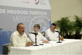 MÉRIDA, YUCATÁN, 07JUNIO2016.- Manuel Marrero Cruz, ministro de Turismo de Cuba; Enrique de la Madrid Cordero, titular de la Secretaría de Turismo, y Rolando Zapata Bello, gobernador de la entidad, inauguraron el primer Foro de Negocios Turísticos entre México-Cuba. FOTO: FRANCISCO BALDERAS /CUARTOSCURO.COM