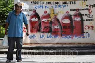 TLAPA, GUERRERO, 09JUNIO2016.- Jóvenes con el rostro cubierto realizaron una pinta en el Monumento a los Niños Héroes, el cual fue colocado por el 93 Batallón de Infantería. El acto se realizó en protesta por la participación del ejercito en la represión hacia los profesores y el Movimiento Popular Guerrerense el pasado 07 de junio en donde perdió la vida Antonio Vivar Díaz por un disparo realizado por policias federales. FOTO: SALVADOR CISNEROS /CUARTOSCURO.COM