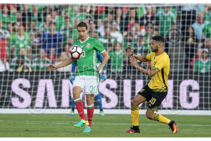PASADENA CALIFORNIA, ESTADOS UNIDOS, 09JUNIO2016.- Hirving Lozano festeja con Oribe Peralta el segundo gol anotadora el equipo tricolor durante el encuentro entre la Selección de México y su similar de Jamaica, realizado en el estadio Rose Bowl, correspondiente a la segunda fecha del grupo C de la Copa América Centenario. Marcador final. México 2, Jamaica 0. FOTO: CHRISTIAN SERNA /CUARTOSCURO.COM