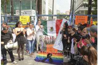 CIUDAD DE MÉXICO, 14JUNIO2016.- Integrantes de la comunidad LGBT colocaron una ofrenda floral frente a la embajada de Estados Unidos, ubicado en avenida Reforma, en señal de luto por la masacre perpetrada en un bar gay en la ciudad de Orlando en la Unión Americana. FOTO: ARMANDO MONROY /CUARTOSCURO.COM