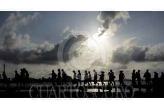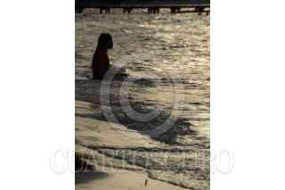 CANCÚN QUINTANA ROO, 14JUNIO2016.- Un barco turístico pasa junto a bañistas al atardecer en playa langosta. FOTO: ELIZABETH RUÍZ /CUARTOSCURO.COM