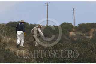 TIJUANA, BAJA CALIFORNIA, 15JUNIO2016.- Agentes de la Subprocuraduría Especializada en Investigación de Delincuencia Organizada (SEIDO) con apoyo de antropólogos y geólogos de la Agencia de Investigación Criminal realizaron una búsqueda de cuerpos enterrados víctimas del crimen organizado en los últimos años. La diligencia se realizó en el cañón Zarco de la colonia Xicoténcatl Leyva, con base en información obtenida por detenidos recluidos en penales, quienes señalaron el lugar aproximado donde fueron arrojados una gran cantidad de cuerpos. Para la localización se utilizaron ondas electromagnéticas que son inyectadas al suelo para explorar sin tener que remover tierra o piedras, además de perros amaestrados. De acuerdo a información emitida por Integrantes de la Asociación por los Desaparecidos de Baja California la suma de personas desaparecidas desde el año 2008 asciende a 1275 de las cuales 18 han sido encontradas e identificadas gracias al trabajo que búsqueda que han realizado junto con especialistas de agencias Federales y elementos de la Sedena. FOTO: CHRISTIAN SERNA /CUARTOSCURO.COM
