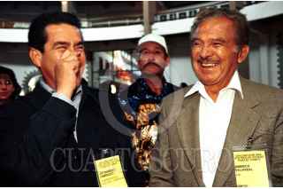 Los priístas Diódoro Carrasco y Américo Villareal cuentan chistes sobre "el cambio", previo a la ceremonia de apertura del diálogo por una política de Estado para el campo. Esta mañana en el palacio Negro de Lecumberri, ahora edificio del Archivo General de la Nación. FOTO: Juan Pablo Zamora/CUARTOSCURO.COM