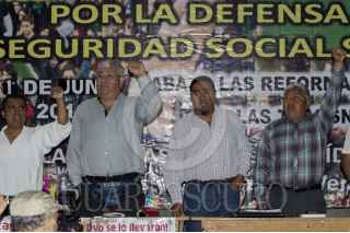 CIUDAD DE MÉXICO, 19JUNIO2016.- Eligio Hernández, coordinador de prensa y vocero de la Sección 22 de la Coordinadora Nacional de Trabajadores de la Educación; Enrique Enríquez, dirigente de la sección 9 de la CNTE; Juan Ochoa, dirigente de la sección 18 de la CNTE y Reyes Ramos, dirigente de la CNTE en Guerrero, durante la conferencia de prensa que la Coordinadora ofreció con motivo de los enfrentamientos suscitados en diversos estados de la República entre maestros y autoridades, al igual que para dar su postura ante los delitos de los que se acusa a su compañero Rubén Núñez, dirigente de la sección 22. FOTO: GALO CAÑAS /CUARTOSCURO.COM