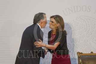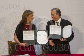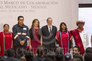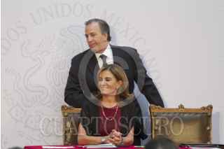 CIUDAD DE MÉXICO, 22JUNIO2016.- Elena Tanus Meouchi, directora general del Servicio Postal Mexicano (Sepomex), y José Antonio Meade, secretario de Desarrollo Social, encabezaron la firma del convenio marco de colaboración entre el Servicio Postal Mexicano y Sedesol, en el Palacio Postal. FOTO: MOISÉS PABLO /CUARTOSCURO.COM