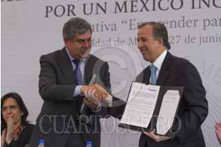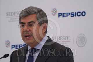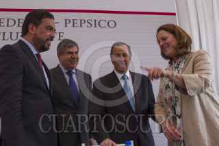 CIUDAD DE MÉXICO, 27JUNIO2016.- Francisco Merino, vicepresidente jurídico y de asuntos de gobierno de PepsiCo; Pedro Padierna Bartning, presidente de PepsiCo México; José Antonio Meade, secretario de Desarrollo Social, y Susan Pick, fundadora de Yo quiero Yo puedo, durante la firma de declaración conjunta entre la Sedesol y PepsiCo "Por un México Incluyente". FOTO: MOISÉS PABLO /CUARTOSCURO.COM