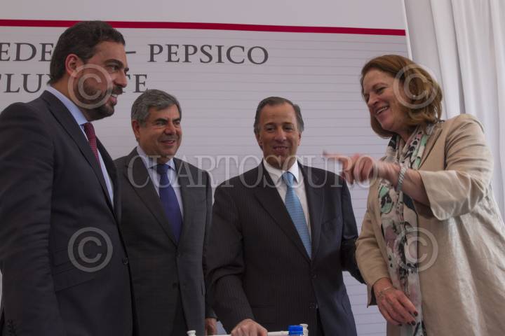 CIUDAD DE MÉXICO, 27JUNIO2016.- Francisco Merino, vicepresidente jurídico y de asuntos de gobierno de PepsiCo; Pedro Padierna Bartning, presidente de PepsiCo México; José Antonio Meade, secretario de Desarrollo Social, y Susan Pick, fundadora de Yo quiero Yo puedo, durante la firma de declaración conjunta entre la Sedesol y PepsiCo "Por un México Incluyente". FOTO: MOISÉS PABLO /CUARTOSCURO.COM