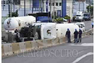 TLALNEPANTLA, ESTADO DE MÉXICO, 27JUNIO2016.- Un pipa de gas volcó sobre la avenida Gustavo Baz y Mariano Escobedo, no hubo lesionados, pero los trabajos de restablecimiento de la pesada unidad provocó intenso caos vial. FOTO: ARMANDO MONROY /CUARTOSCURO.COM