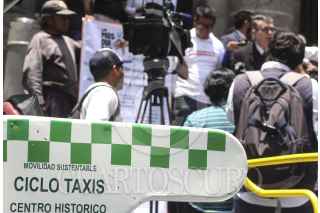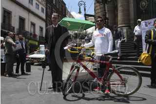CIUDAD DE MÉXICO, 28JUNIO2016.- El diputado por Morena, Alfonso Suárez del Real, dio conferencia en las escalinatas de la ALDF para presentar el prototipo de bicitaxi urbano, conocido como "mosquito". La unidad cuenta con un panel de celdas solares y una bicicleta conducida por un chofer. FOTO: MARÍA JOSÉ MARTÍNEZ /CUARTOSCURO.COM