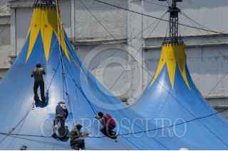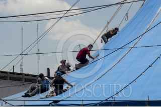 CIUDAD DE MÉXICO, 28JUNIO2016.- Trabajadores del circo ubicado en avenida Insurgentes a un costado del metrobús El Chopo limpiaron la lona del establecimiento. FOTO: GALO CAÑAS /CUARTOSCURO.COM