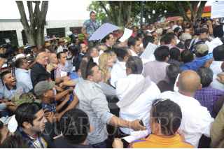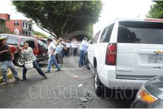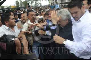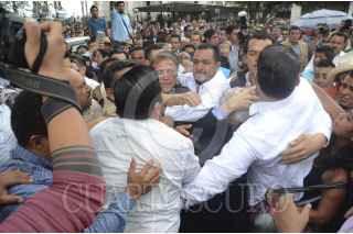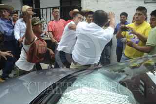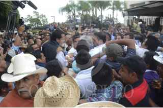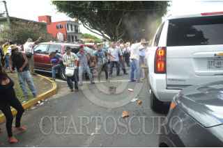 XALAPA, VERACRUZ, 29JUNIO2016.- Integrantes de los 400 pueblos protestaron afuera del congreso local donde se encontraba el dirigente nacional del PAN, Ricardo Anaya; el gobernador electo Miguel Ángel Yunes, y Santiago Creel, quienes al salir del recinto fueron agredidos con piedras y palos, las camionetas en las que se transportaban fueron apedreadas y uno de sus elementos de seguridad resulto herido. FOTO: ALBERTO ROA /CUARTOCURO.COM