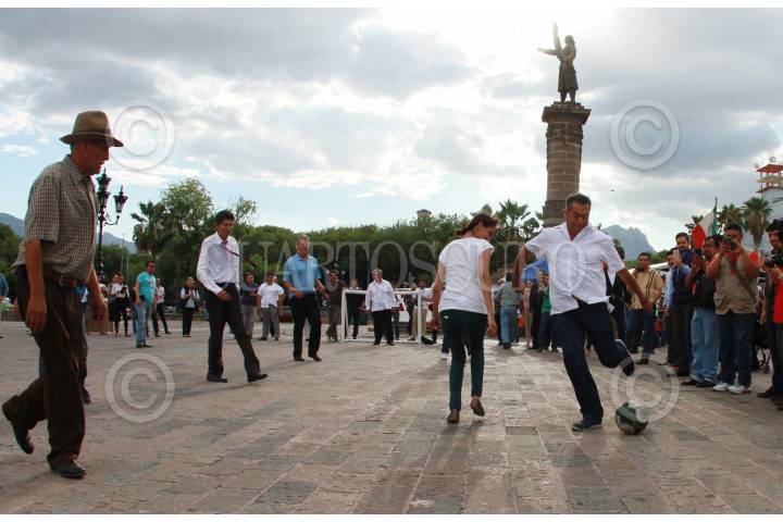MONTERREY, NUEVO LEÓN, 20JULIO2016.- El Gobernador Jaime Rodríguez Calderón diálogo hoy con maestros que se manifiestan en contra de la Reforma Educativa. En la Explanada de los Héroes, Rodríguez Calderón escuchó las peticiones de profesores que demandan la abrogación de la reforma. Al salir del Palacio de Gobierno, El Bronco fue invitado a jugar una "cascarita" de futbol con profesores de la Coordinadora de Regiones que mantienen un plantón en la Explanada. FOTO: PRENSA GOBIERNO NL /CUARTOSCURO.COM