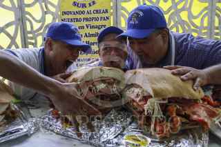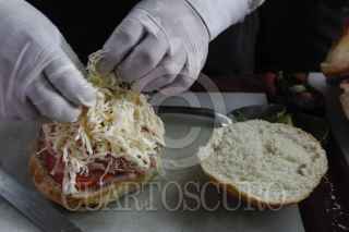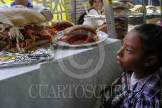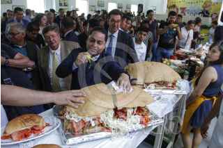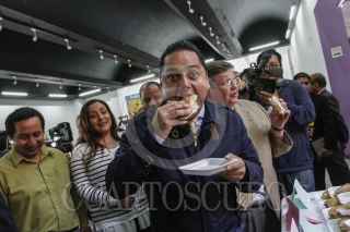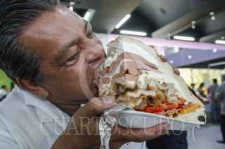 CIUDAD DE MÉXICO, 20JULIO2016.- Torteros de todo el país y autoridades de la delegación Venustiano Carranza anunciaron la 13a Feria de la Torta a realizarse en esa demarcación del 27 al 31 de julio próximo. En la imagen, el delegado Israel Moreno Rivera, durante la degustación. FOTO: ISAAC ESQUIVEL /CUARTOSCURO.COM