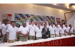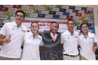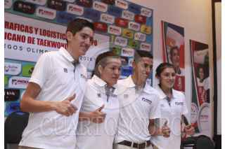 CIUDAD DE MÉXICO, 20JULIO2016.- Los taekwondoínes que participarán en los Juegos Olímpicos de 2016 en Río de Janeiro; Saul Gutiérrez Macedo, María del Rosario Espinoza, Carlos Rubén Navarro Valdéz, Itzel Adilene Manjarrez Bastidas y Francisco Raymundo González Pinedo, Presidente de la FMTKD, ofrecieron una conferencia de prensa para hablar sobre logística del equipo durante la justa deportiva. FOTO: GABINO ACEVEDO /CUARTOSCURO.COM