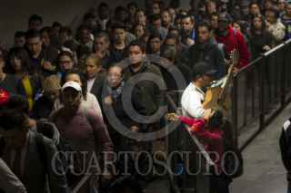CIUDAD DE MÉXICO, 21JULIO2016.- Mientras el padre toca la guitarra y la armónica, su hija pide en una pequeña tacita de metal cooperación por la música, mientras, los viajeros del metro apresuran el paso para llegar en a sus destinos. FOTO: MOISÉS PABLO /CUARTOSCURO.COM