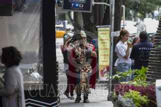 CIUDAD DE MÉXICO, 23JULIO2016.- Un joven ofrece una danza prehispánica por los restaurantes de la colonia Condesa, lo acompañan su mujer y su hijo de brazos. FOTO: MOISÉS PABLO /CUARTOSCURO.COM