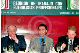 Martín Herrera, José María Huerta, presidente de la Asociación Futbolistas Agremiados de Mexico y Arturo Escobar, sostuvieron una reunión de trabajo en el Recinto de San Lázaro, para analizar el sindicato de futbolistas. FOTO: Christian Palma/CUARTOSCURO.COM