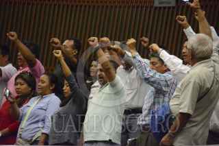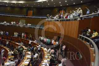 CHILPANCINGO, GUERRERO, 26JULIO2016.- Policías estatales con equipo antimotimes resguardaron el Congreso del estado, luego de que un grupo de la Asamblea Popular de Pueblos de Guerrero (APG) ingresó a la sala de visitantes y exigieron copias de la lectura de los puntos de acuerdo. Cuando se retiraron dialogaron con la diputada presidente Flor Ocampo Añorve y la diputa Erika Alcaraz Sosa, coordinadora de la fracción del PRD. FOTO: JOSE I. HERNÁNDEZ /CUARTOSCURO.COM
