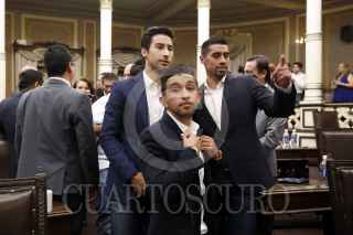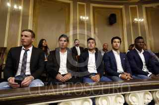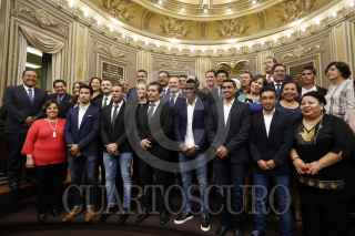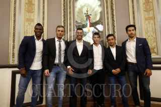 PUEBLA, PUEBLA, 27JULIO2016.- Christian "El Hobbit" Bermúdez, Eduardo Pérez, Francisco Arizala, Patricio Araujo y Matías Alustiza, jugadores del Club Puebla acompañados por Roberto Ruíz Esparza, titular del Instituto Poblano del Deporte y Carlos Poblete; asistieron al congreso del estado donde se aprobó la iniciativa de ley sobre la penalización por violencia en estadios de fútbol. FOTO: HILDA RÍOS/ CUARTOSCURO.COM