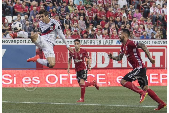 TIJUANA, BAJA CALIFORNIA, 30JULIO2016.- Váctor Malcorra (V) disputa la bola con Néstor Calderón durante el partido entre Xoloitzcuintles de Tijuana y Chivas de Guadalajara, realizado en el Estadio Caliente la noche de ayer, correspondiente tercera Jornada del torneo de Apertura 2016 de la Liga MX del fútbol mexicano. FOTO: CHRISTIAN SERNA /CUARTOSCURO.COM