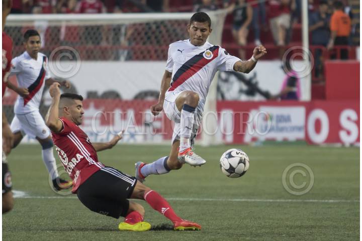 TIJUANA, BAJA CALIFORNIA, 30JULIO2016.- Váctor Malcorra (V) disputa la bola con Néstor Calderón durante el partido entre Xoloitzcuintles de Tijuana y Chivas de Guadalajara, realizado en el Estadio Caliente la noche de ayer, correspondiente tercera Jornada del torneo de Apertura 2016 de la Liga MX del fútbol mexicano. FOTO: CHRISTIAN SERNA /CUARTOSCURO.COM