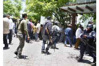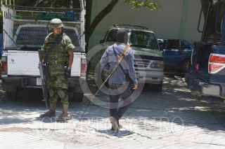 CHILPANCINGO GUERERRO, 01AGOSTO2016.- Habitantes de Tlaltempanapa se enfrentaron a golpes con policías estatales y militares, en el puente vehicular Atempa, ellos se dirigían a colocar una ofrenda floral en memoria de tres de sus compañeros transportistas, el 17 de julio. El zafarrancho se originó cuando las autoridades no les permitieron el paso, debido que los acompañaban un contingente del grupo de policías comunitarios “Por la Paz y la Justicia”, quienes iban armados con rifles y escopetas. En la trifulca una arma se acciono rompiendo un vidrio de una patrulla. Al final entablaron un dialogo con el presidente municipal Roberto Zapoteco Castro, para calmar las cosas. FOTO: JOSÉ I. HERNÁNDEZ / CUARTOSCURO.COM
