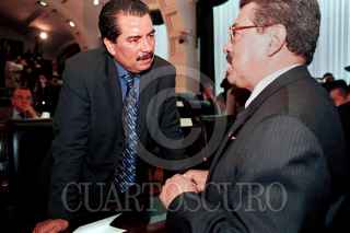 Los legisladores priístas Rafael Oceguera y Edurado Andrade, conversan antes de iniciar los trabajos de la comisión permanente del congreso de la unión. FOTO: David García/CUARTOSCURO.COM