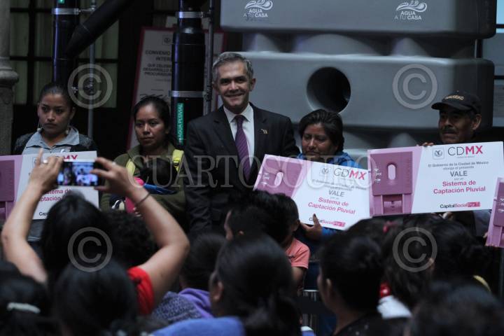 CIUDAD DE MÉXICO, 04AGOSTO2016.- Miguel Ángel Mancera, jefe de gobierno capitalino, entregó 112 sistemas de captación de agua pluvial, los cuales cumplirán con la función de proporcionar agua potable a vecinos de las colonias en Iztapalapa y Xochimilco. Estuvo acompañado por Ramón Aguirre, director general del Sistema de Aguas de la Ciudad de México, José Ramón Amieva, secretario de Desarrollo Social, y la delegada en Iztapalapa, Done Anguiano. FOTO: MARÍA JOSÉ MARTÍNEZ /CUARTOSCURO.COM