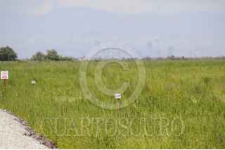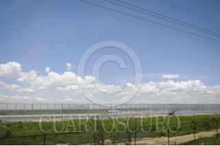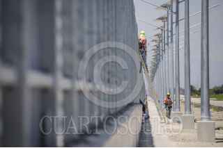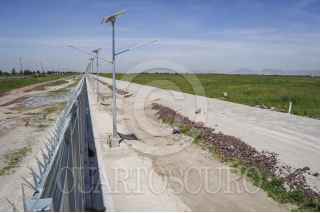 CIUDAD DE MÉXICO, 04AGOSTO2016.- Trabajadores instalan la barda perimetral de lo que será el nuevo aeropuerto internacional de la Ciudad de México (NAICM) en la zona federal del ex-vaso de Texcoco. Además se instalan lámparas con panel solar, baterías de litio y focos led que consumen menos energía. El muro que rodea mide 33 kilómetros y avanza en cuatro frentes (norte, sur, oriente y poniente). FOTO: DIEGO SIMÓN SÁNCHEZ /CUARTOSCURO.COM
