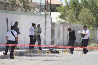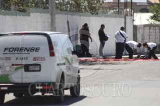 CIUDAD JUÁREZ, CHIHUAHUA, 04AGOSTO2016.- La persecución de dos hombres culminó con la ejecución de uno y el secuestro de otro, en vialidades del fraccionamiento Praderas de los Oasis. El cuerpo de la víctima quedó sobre el asfalto, en el cruce de avenida La Paz y calle Oasis de Ruanda, con múltiples impactos de bala en el cuerpo. Agentes ministeriales localizaron al menos una decena de casquillos percutidos. En la escena, quedaron abandonados dos vehículos, un auto Ford Focus color gris, y una camioneta Dodge Nitro color blanco, en las que se movilizaban los agredidos. FOTO: NACHO RUIZ /CUARTOSCURO.COM